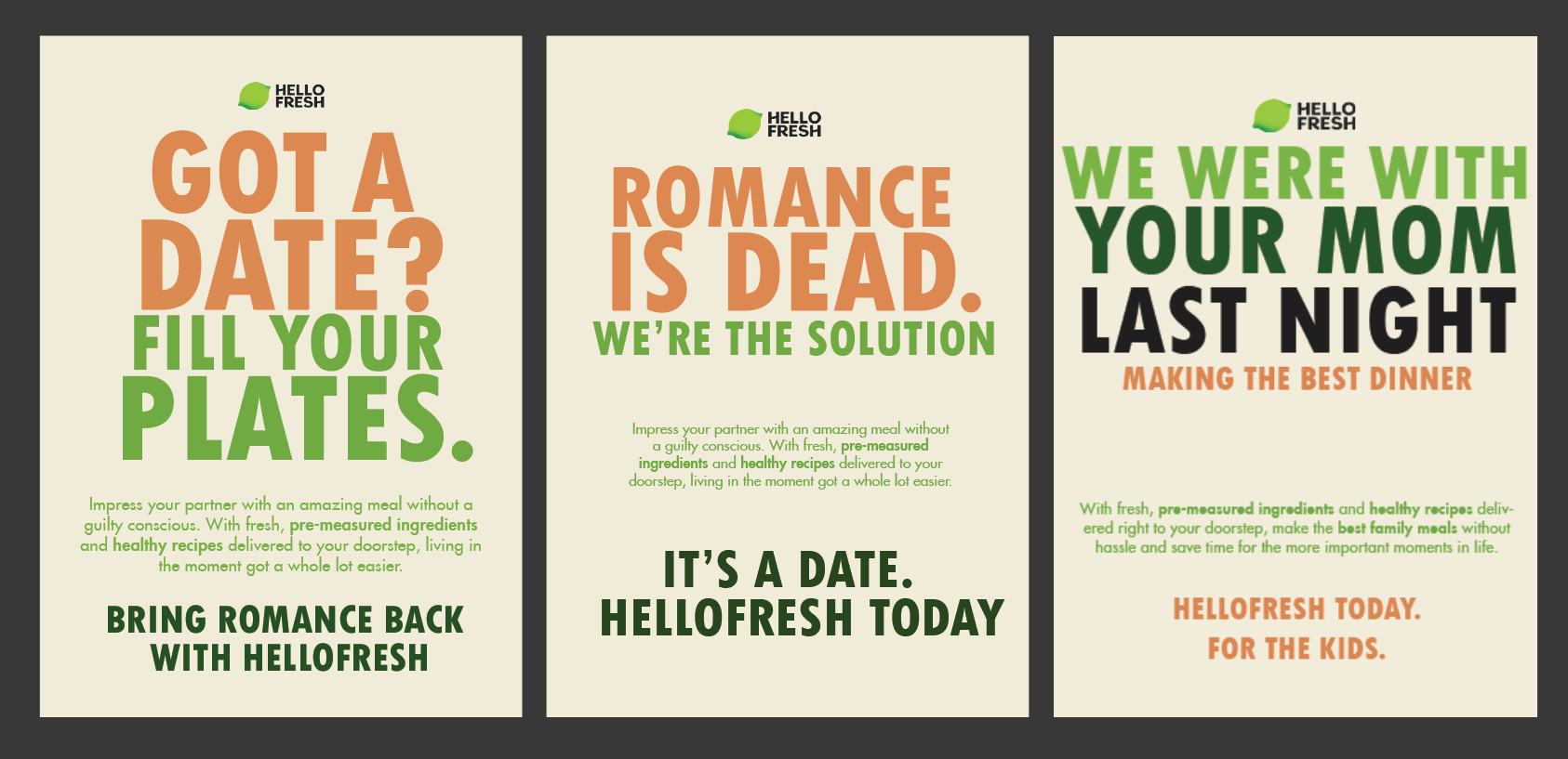 In the development and ideation stage, I copywrote 3 different versions utilising HelloFresh's brand identity. The third design was selected as the final design and moved forward into refinement as it had the most impact.